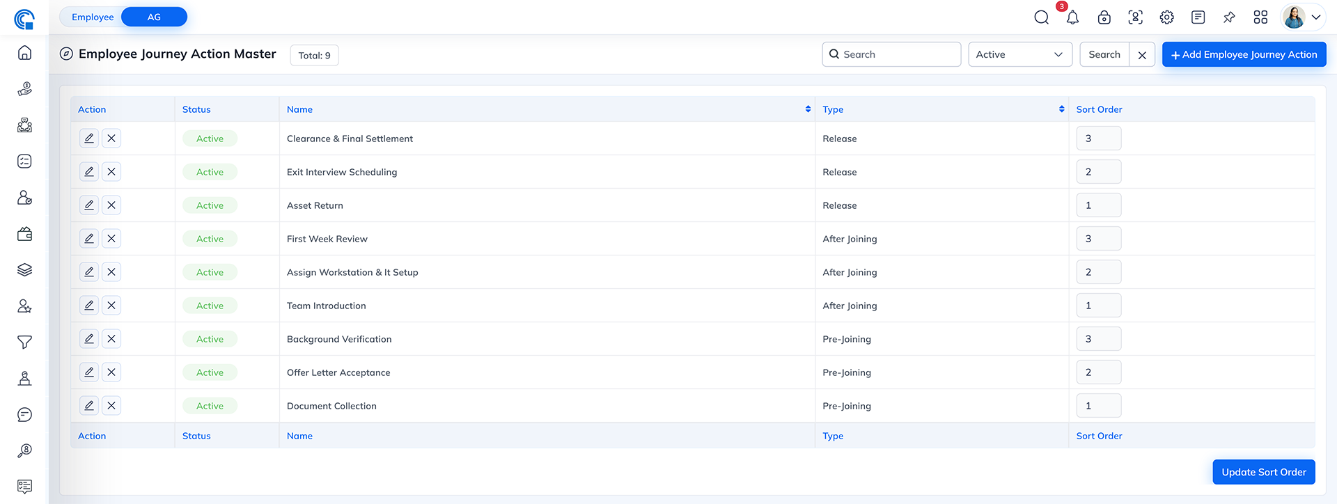 Once saved, this action appears under the Employee Journey Action Master List, with sorting determined by the Sort Order column.
