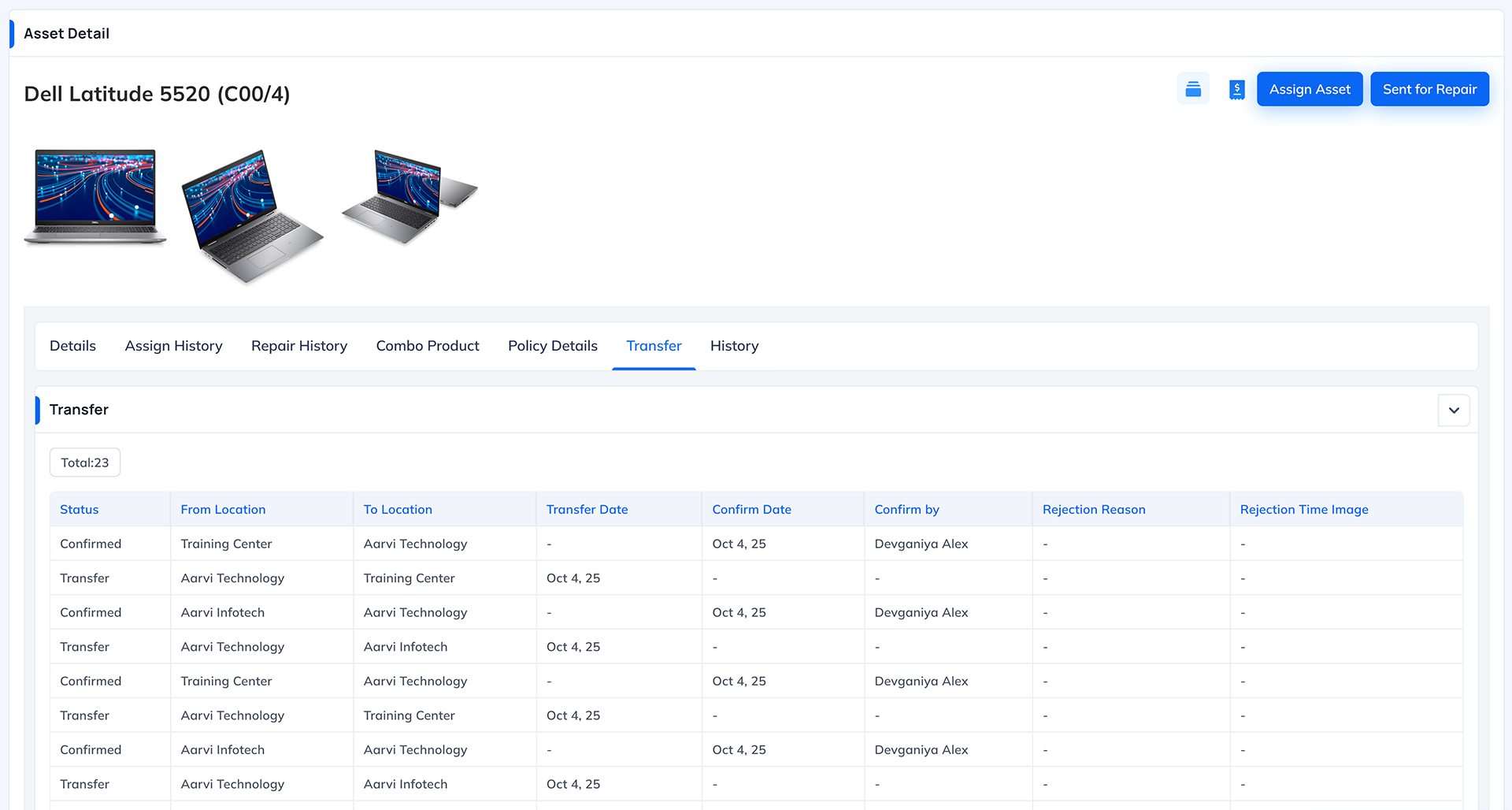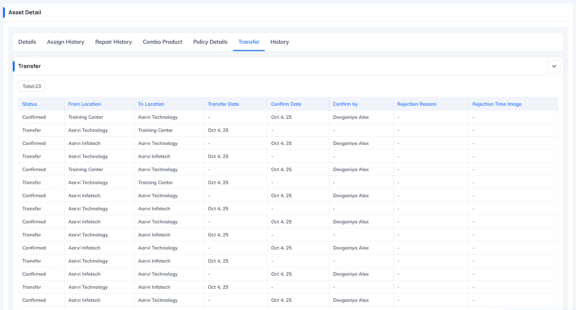Manage and monitor asset transfers across multiple branches or locations with full traceability.