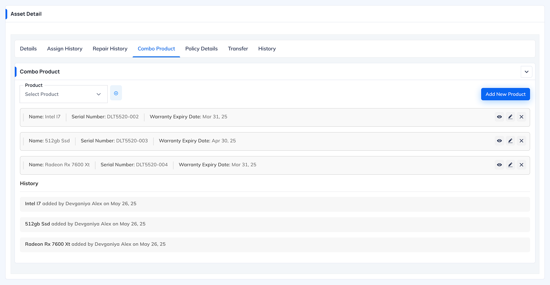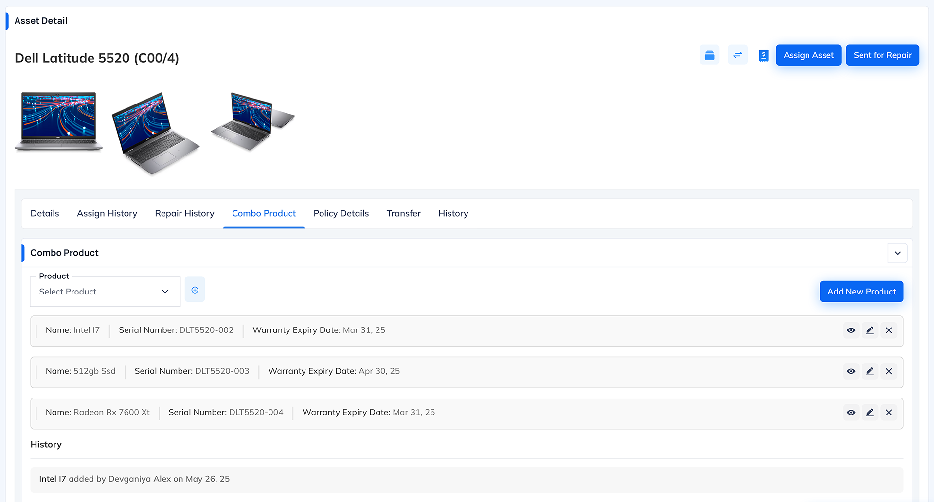Simplified management of complex assets: Manage combo products (like CPUs with multiple components) as a single unit while still keeping visibility of individual parts.