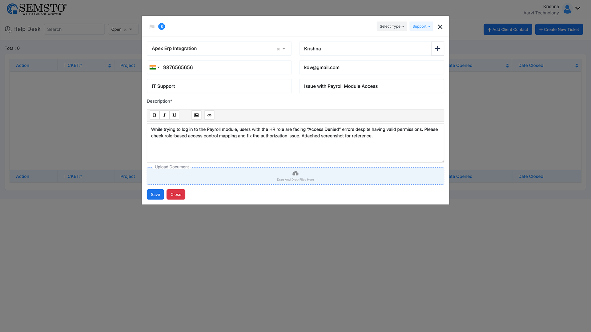 Clients can raise detailed tickets with supporting documents and messages, while your team can update statuses, share progress and close issues seamlessly.
