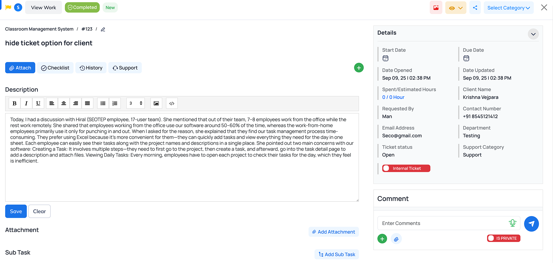 Clients and support staff can exchange replies, clarifications and attachments within the ticket until resolution.